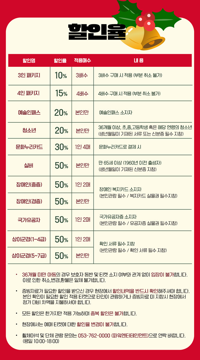 ÆòÀÏ 19½Ã 30ºÐ, Åä¿äÀÏ 15½Ã/18½Ã, ÀÏ¿äÀÏ/Å©¸®½º¸¶½º 15½Ã (*¿ù¿äÀÏ °ø¿¬ ¾øÀ½)