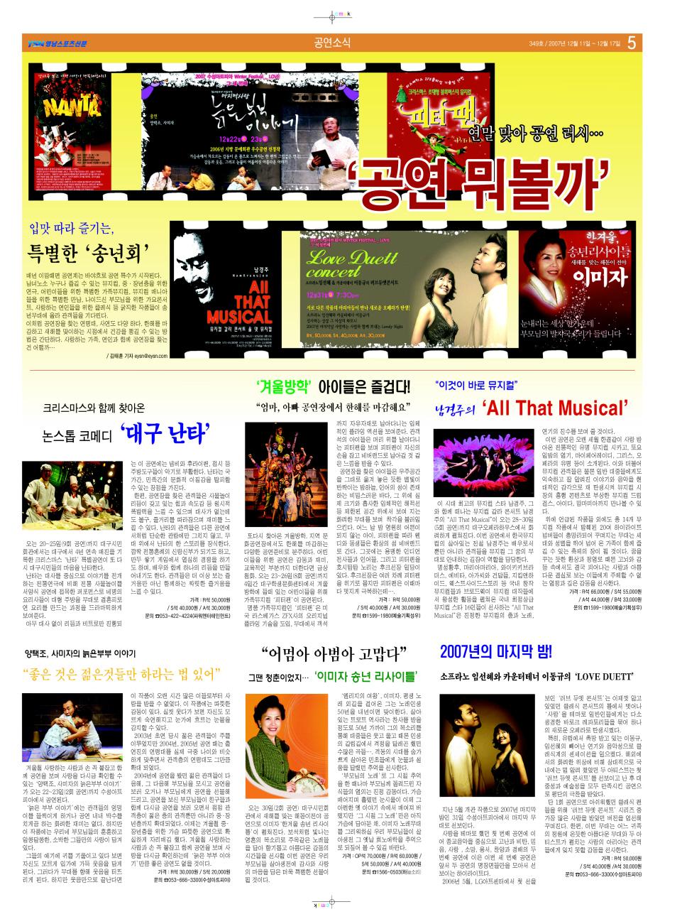 ÀÌ ½Ã´ë ÃÖ°íÀÇ ¹ÂÁöÄà ½ºÅ¸ ³²°æÁÖ, ±×¿Í ÇÔ²² ¶°³ª´Â ¹ÂÁöÄà °¥¶ó ÄܼƮ ³²°æÁÖÀÇ ¡°All That Musical¡±ÀÌ ¿À´Â 28~30ÀÏ(5ȸ °ø¿¬)±îÁö ´ë±¸¿ÀÆä¶óÇϿ콺¿¡¼ È·ÁÇÏ°Ô ÆîÃÄÁø´Ù. À̹ø °ø¿¬¿¡¼ Çѱ¹¹ÂÁöÄÃÀÇ »ì¾ÆÀÖ´Â Àü¼³ ³²°æÁÖ´Â ¹è¿ì·Î¼ »Ó¸¸ ¾Æ´Ï¶ó °ü°´µéÀ» ¹ÂÁöÄà ±× ²ÞÀÇ ¹«´ë·Î ¾È³»ÇÏ´Â ±æÀâÀÌ ¿ªÇÒÀ» ´ã´çÇÑ´Ù.